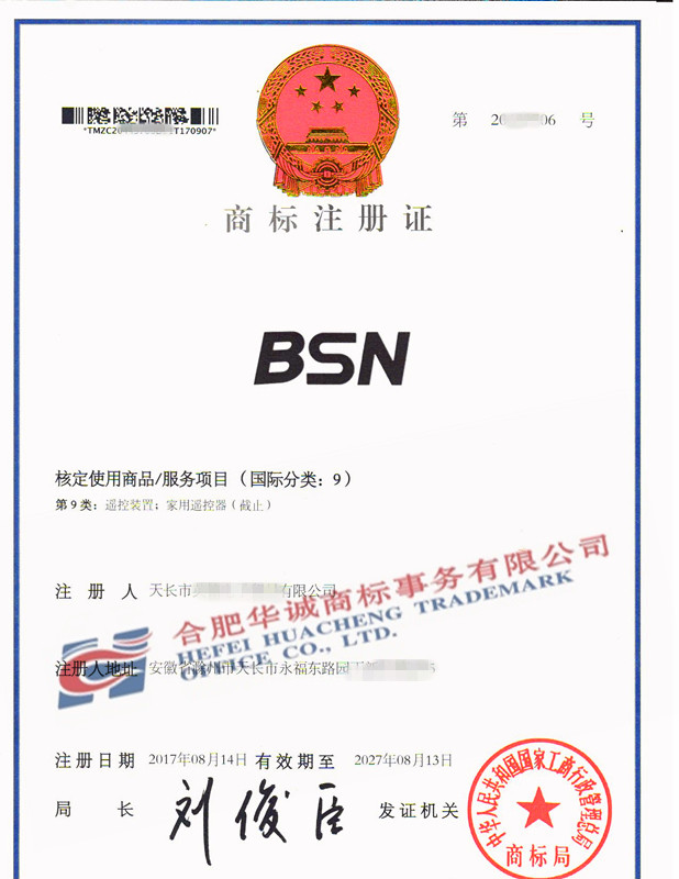 您委托我所代理商标注册申请,名称为“BSN” 9类商标注册证已下达。