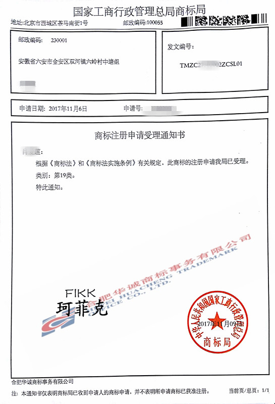 您委托我所代理商标注册申请,名称为“珂菲克”19类商标已被国家商标局受理。
