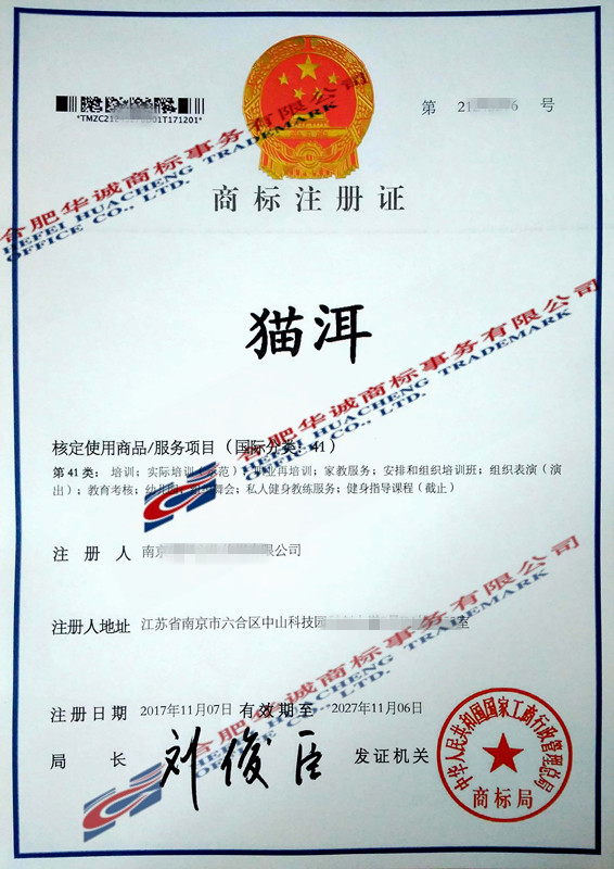 您委托我所代理商标注册申请,名称为“猫洱” 41类商标注册证已下达。