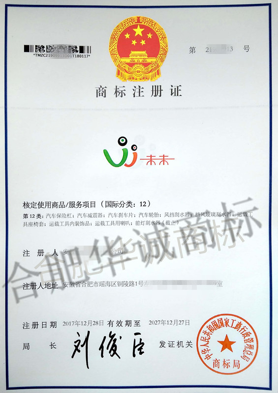 您委托我所代理商标注册申请,名称为“未未及图” 12类商标注册证已下达。