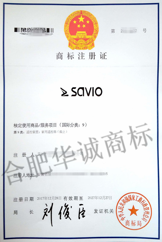 您委托我所代理商标注册申请,名称为“savio” 9类商标注册证已下达。