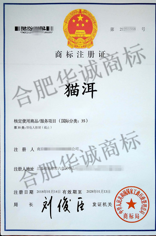 您委托我所代理商标注册申请,名称为“猫洱” 35类商标注册证已下达。