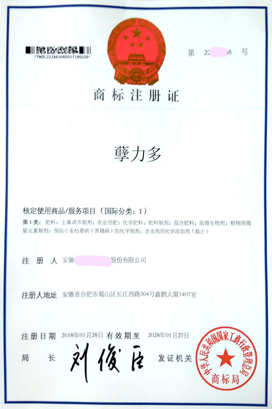 “孽力多” 1类商标注册证下达