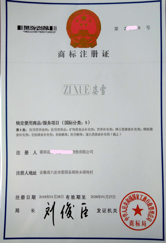 您委托我所代理商标注册申请,名称为“姿雪”5类商标注册证已下达。