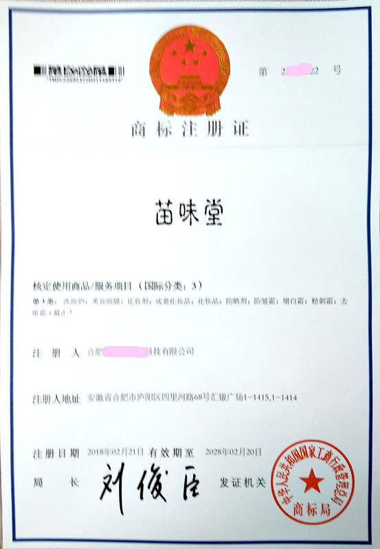 您委托我所代理商标注册申请,名称为“苗味堂”3类、5类商标注册证已下达。