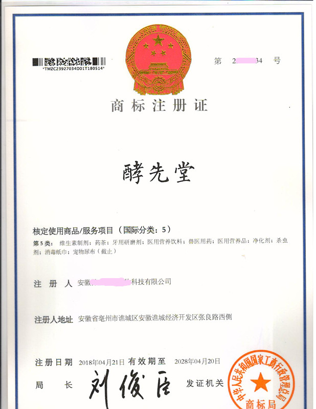 您委托我所代理商标注册申请,名称为“酵先堂”5类商标注册证已下达。