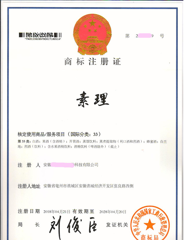 “素理”33类商标注册证下达