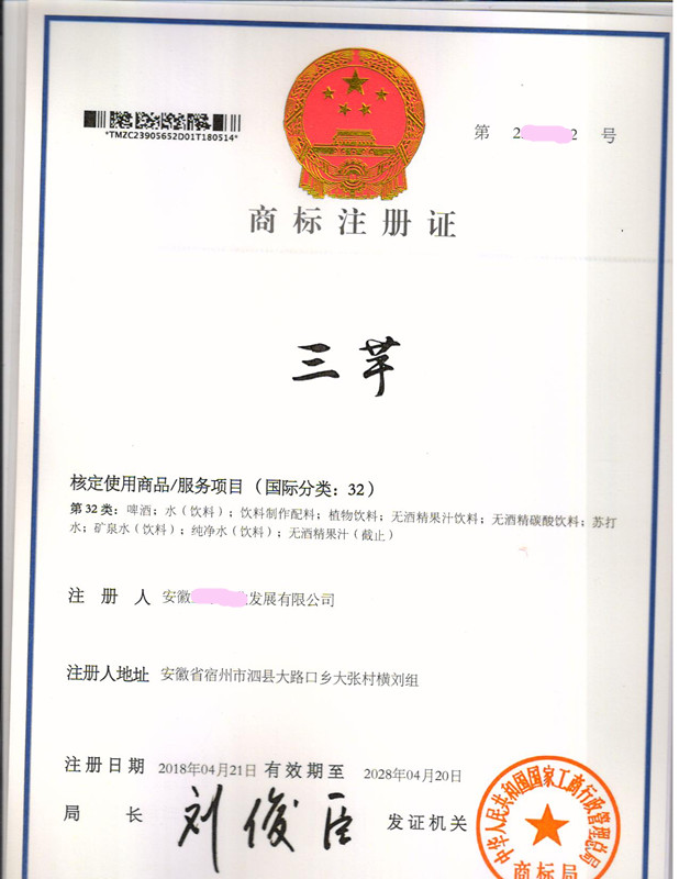 “三芋”32类商标注册证下达