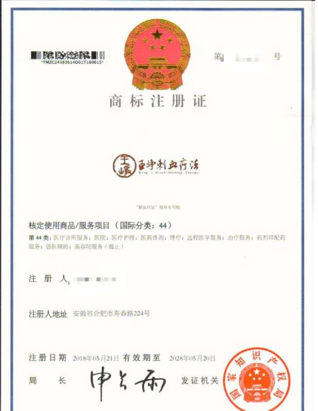您委托我所代理商标注册申请,名称为“王峥刺血疗法”44类商标注册证已下达。