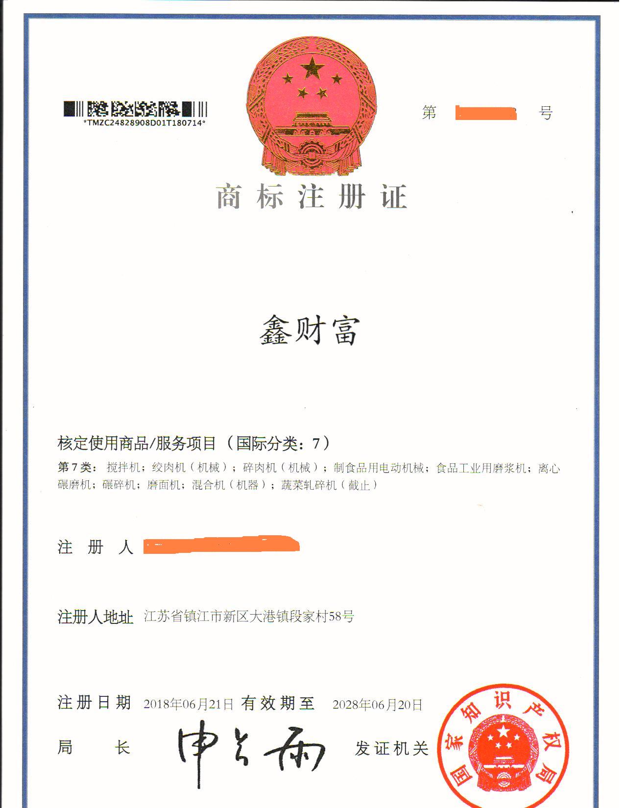 “鑫财富”7类商标注册证下达