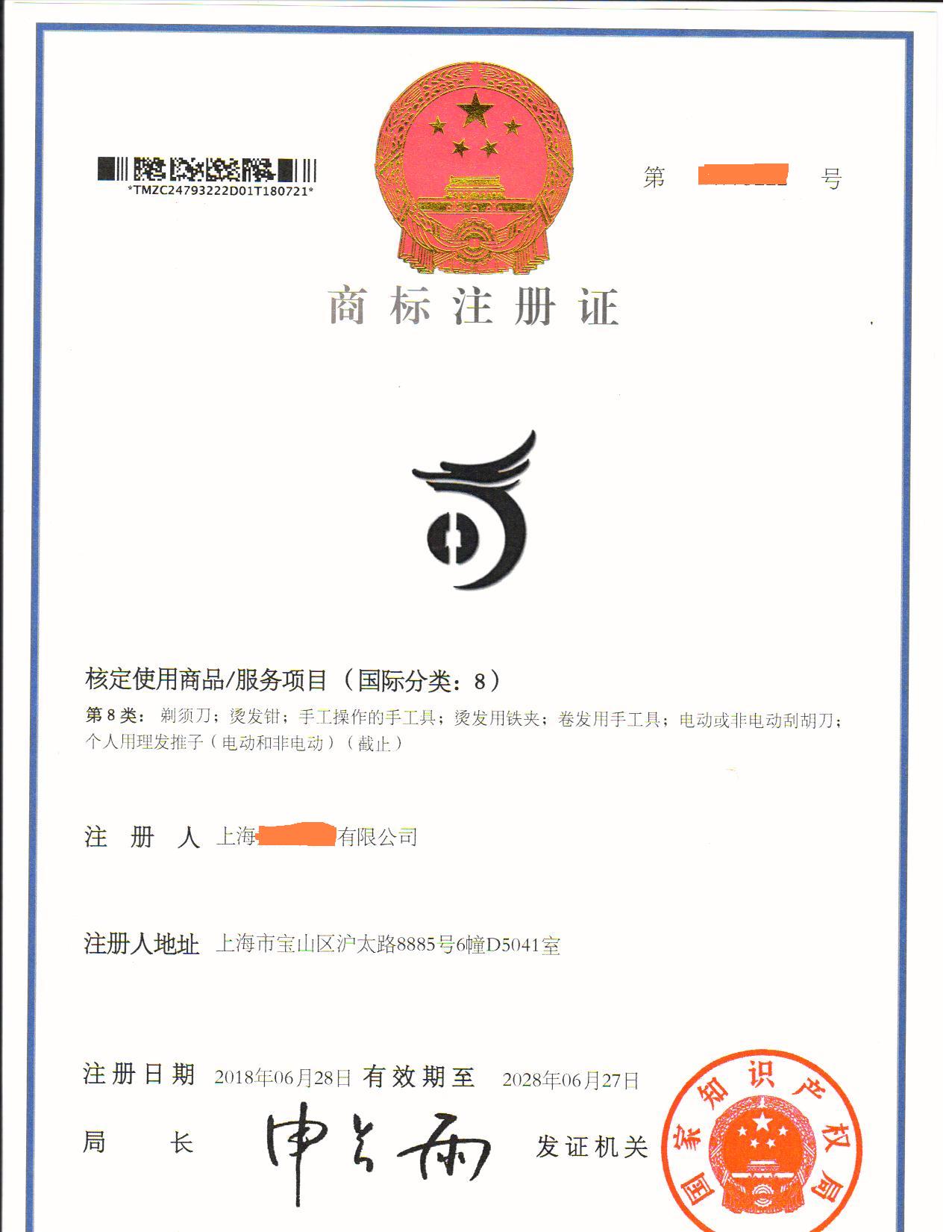 您委托我所代理商标注册申请,名称为“图形”8类商标注册证已下达。